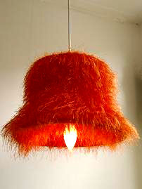 Materiaal brazilialungolamp: ijzeren frame met daar overheen een oranje,gebreid jasje van 100 % polyester. Lamp met een puntje.